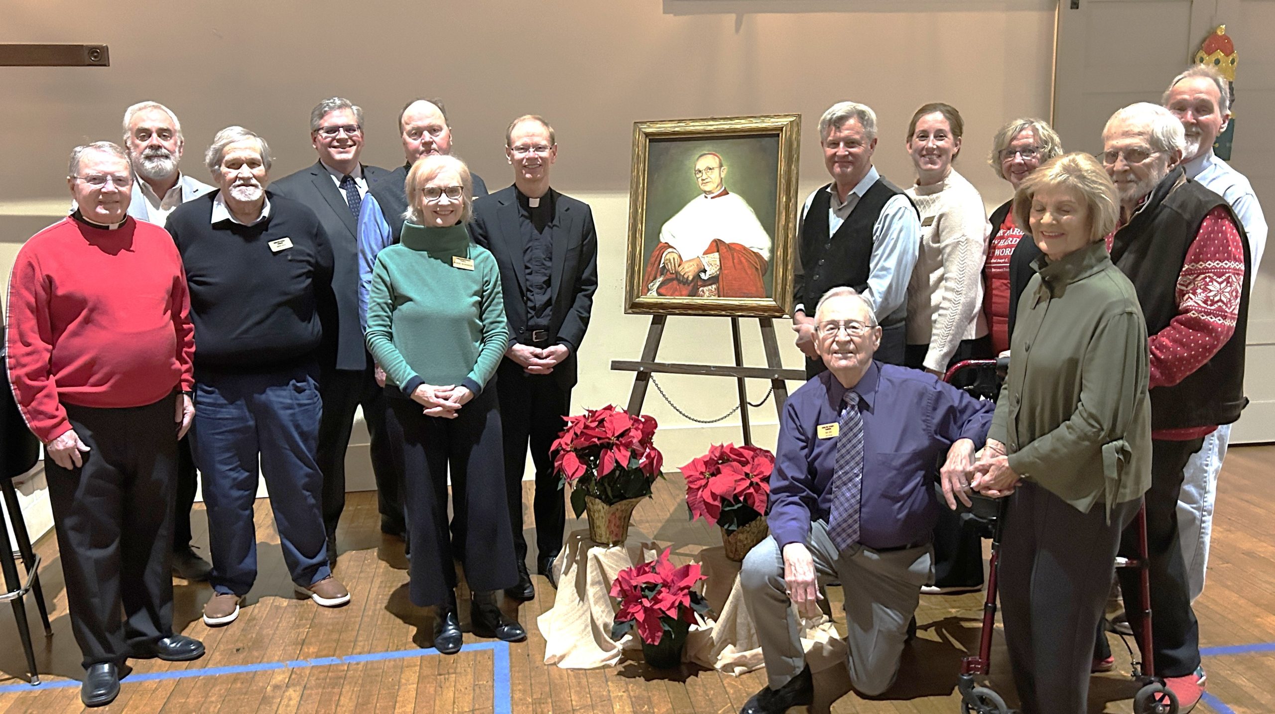 Members of the Board of Directors as of December 16, 2025 with President of University of Notre Dame Fr. Robert Dowd. Left to Right: Fr. Stephen Banet, John Blocker (Chair), David Hock (Founding Chair), Ed Clere, Mike Carter (Vice-Chair), Rosie Shannon (Secretary and cousin of Fr. Dowd), Father Dowd, portrait of Cardinal Joseph E. Ritter, Ray Day (kneeling), Phil Hendershot, Corinne Moore (Treasurer), Sarah Crane, Pat Leist-Stumler, Bob Wells, and Tom Quinkert.